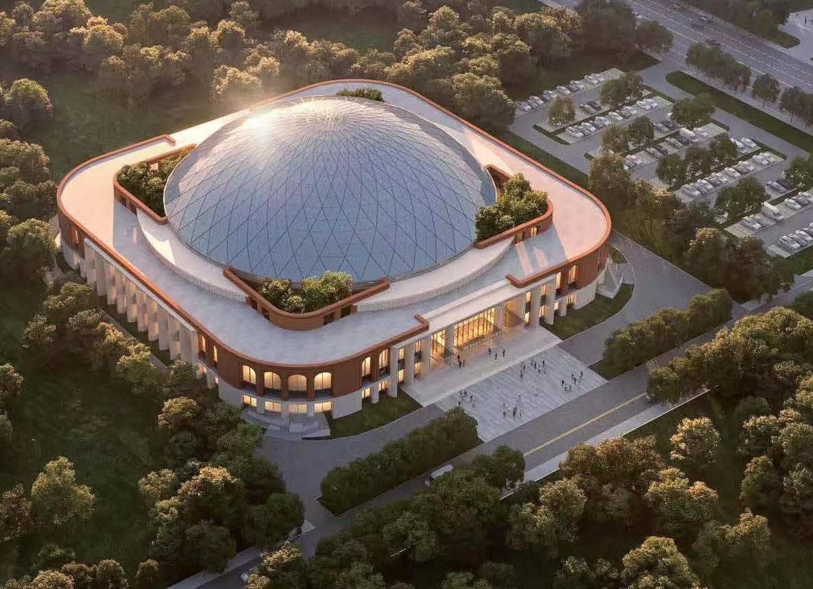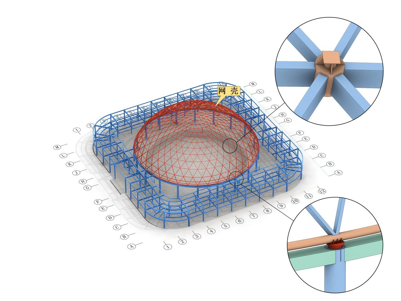項(xiàng)目總建筑面積12673㎡,地下一層為勁性結(jié)構(gòu),地上二層為鋼框架結(jié)構(gòu),主要由箱型柱、H型鋼梁、箱型鋼梁組成,鋼柱主要截面尺寸箱600X25、箱400X20、箱400X16、箱300X10,鋼梁主要截面尺寸箱700X400X25X25、箱700X300X20X20、H750X300X12X25、H650X300X12X20,主要材質(zhì)為Q355、Q235。穹頂網(wǎng)殼鋼屋蓋頂標(biāo)高為33.6m,主要有鼓形節(jié)點(diǎn)和箱型桿件組成,截面規(guī)格為口200X100X8X8、口200X120X8X8、口300X120X8X8、口300X150X10X10、D245X10、D351X16,材質(zhì)為Q355C。鋼結(jié)構(gòu)用鋼量約為1500t。