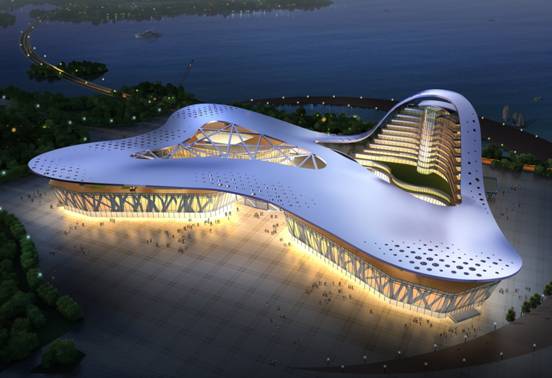 第八屆中國(guó)花卉博覽會(huì)主場(chǎng)館工程位于江蘇省常州市武進(jìn)區(qū)西太湖西畔,東臨攬?jiān)侣?,南臨嘉成路,西臨花卉大道。其造型設(shè)計(jì)來(lái)源于對(duì)古典文化“蝶戀花”的抽象理解,同時(shí)以中國(guó)漢字“八”為原型,突出強(qiáng)調(diào)其作為第“八”屆中國(guó)花博會(huì)主場(chǎng)館的特定歷史含義。