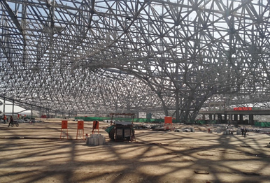 北京新機(jī)場位于永定河北岸,北京市大興區(qū)禮賢鎮(zhèn)、榆垡鎮(zhèn)和河北省廊坊市廣陽區(qū)之間,北距天安門46公里,西距京九鐵路4.3公里,南距永定河北岸大堤約1公里,距首都機(jī)場68.4公里,屬國家重點(diǎn)工程。航站樓及綜合換乘中心(核心區(qū))建筑面積約60萬平米,地下兩層,地上五層,長寬兩個方向的尺度較大,主體結(jié)構(gòu)采用鋼筋混凝土框架結(jié)構(gòu)