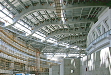 上海光源工程-同步輻射工程(SSRF)位于上海市張江高科技園區(qū),是國家重大科學裝置,可以應(yīng)用同步輻射光進行基礎(chǔ)學科研究和應(yīng)用學科的研究。一期工程總建筑面積為50648平方米。主體建筑占地30166平方木,建筑面積約36625平方米,最高處為20米。主體建筑鋼結(jié)構(gòu)部分主要有異性鋼屋蓋和環(huán)形吊車梁系統(tǒng)組成,整體造型宛如美麗的“鸚鵡螺”,結(jié)構(gòu)造型獨特。